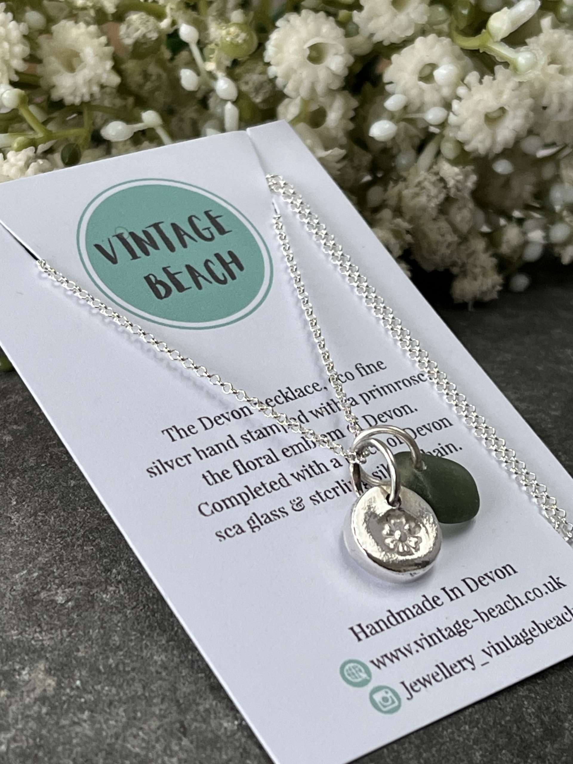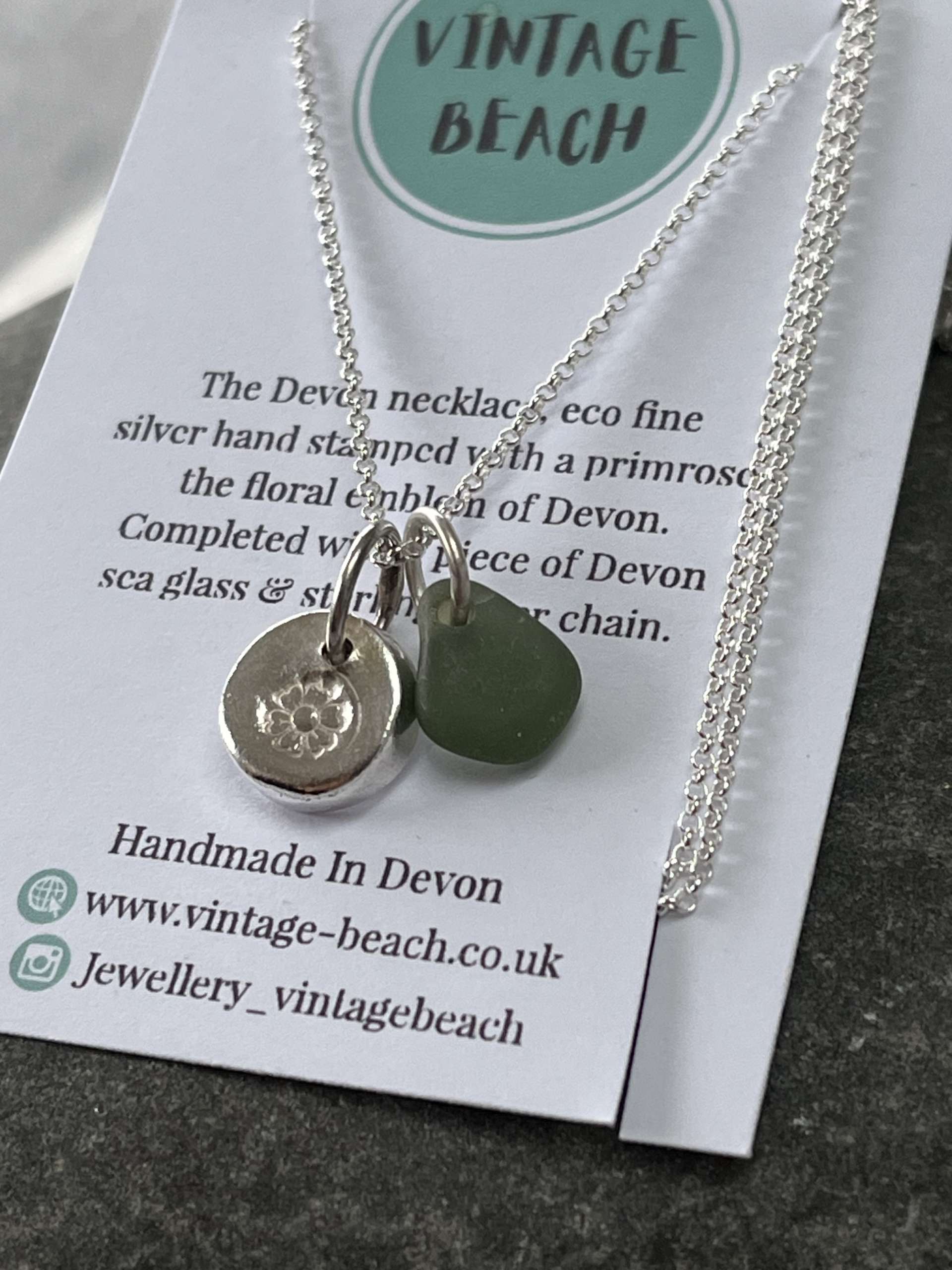 A piece of green Devon sea glass compliments the necklace, which was beach-combed by myself from Broadsands beach in North Devon and is naturally rounded by the waves.