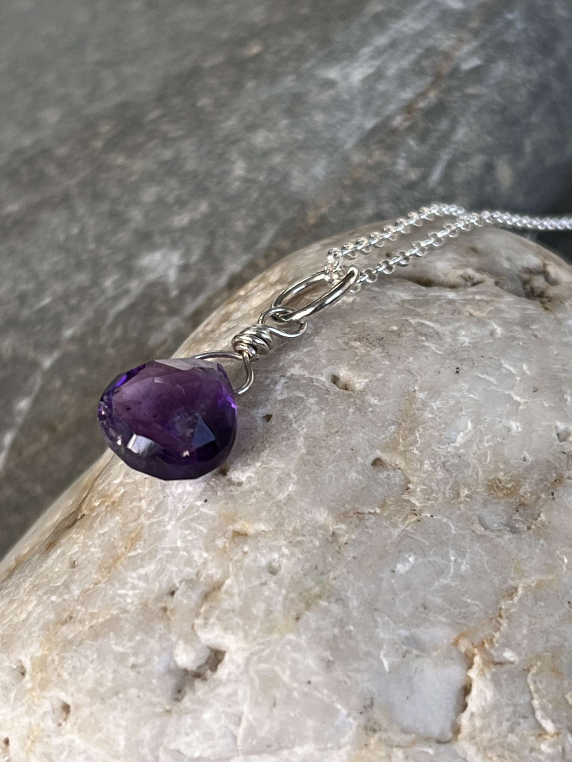 A gorgeous purple Amethyst teardrop gemstone pendant, carefully threaded onto sterling silver wire and suspended from a 18” sterling silver chain.