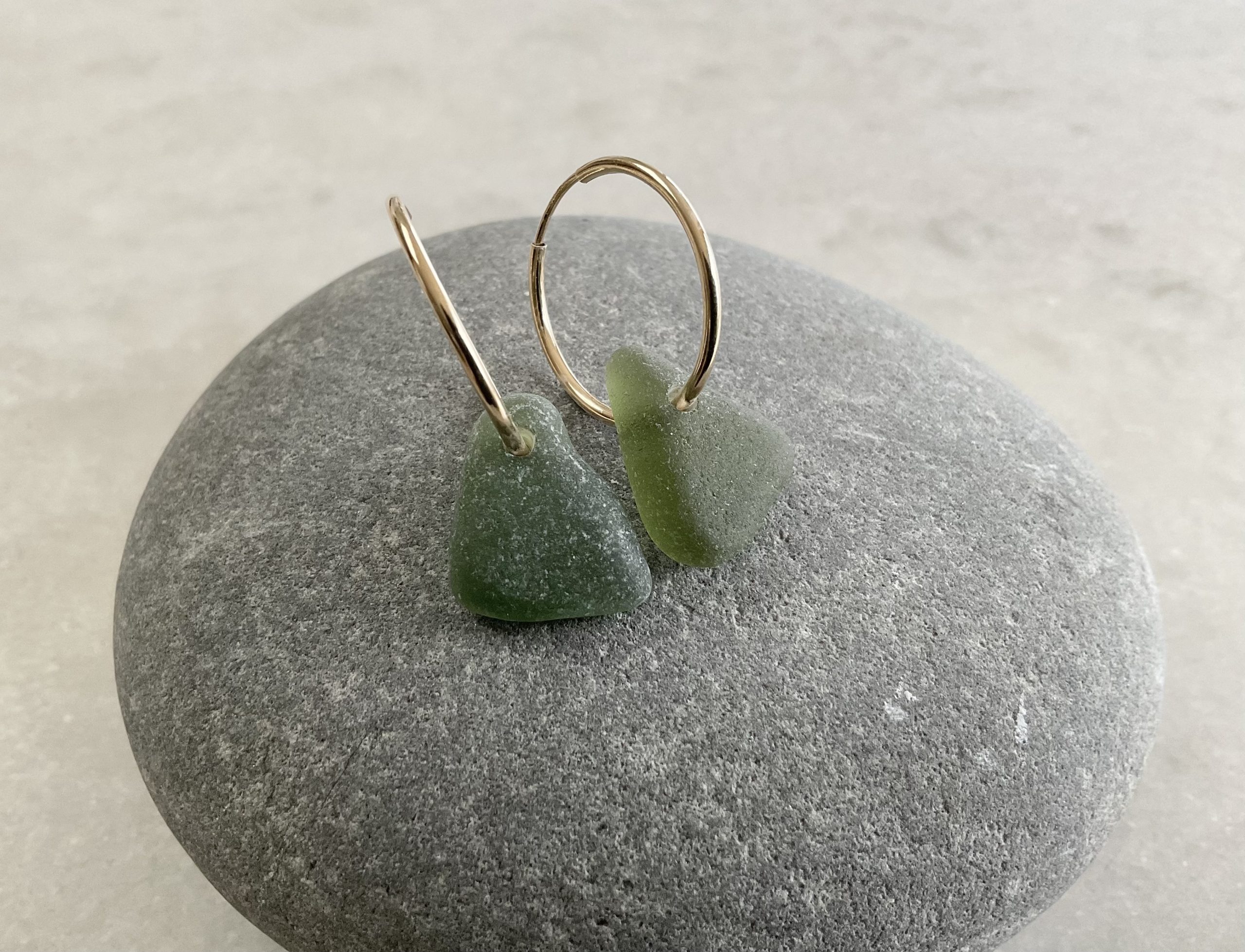 Forest green Devon sea glass & gold fill 20mm hoop earrings